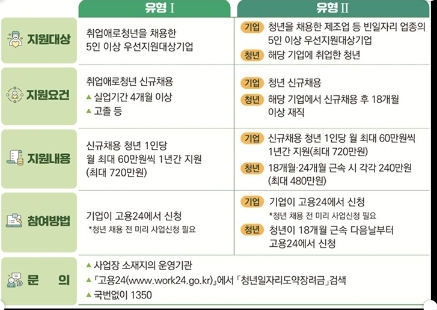 그리고 기업이 6개월 이상 고용을 유지하면 신규채용 청년 1인당 월 최대 60만 원씩, 1년간 최대 720만 원을 지원한다.